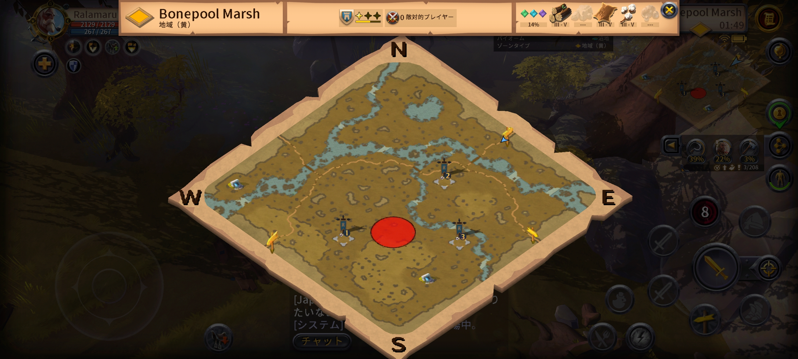 これはフルマップですね。今現在は下のマップにいます。上の大きいマップは、全域が黒エリアです。T7やT8は黒エリアにありますね。黒エリア、PVP主体の本ゲームのメインステージですね。奪うか奪われるかの二択の世界です。