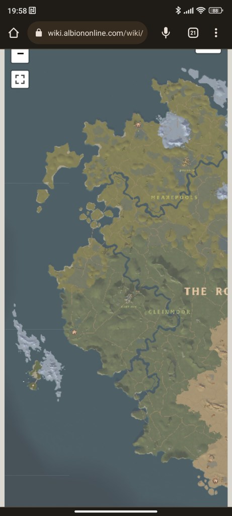 これはフルマップですね。今現在は下のマップにいます。上の大きいマップは、全域が黒エリアです。T7やT8は黒エリアにありますね。黒エリア、PVP主体の本ゲームのメインステージですね。奪うか奪われるかの二択の世界です。